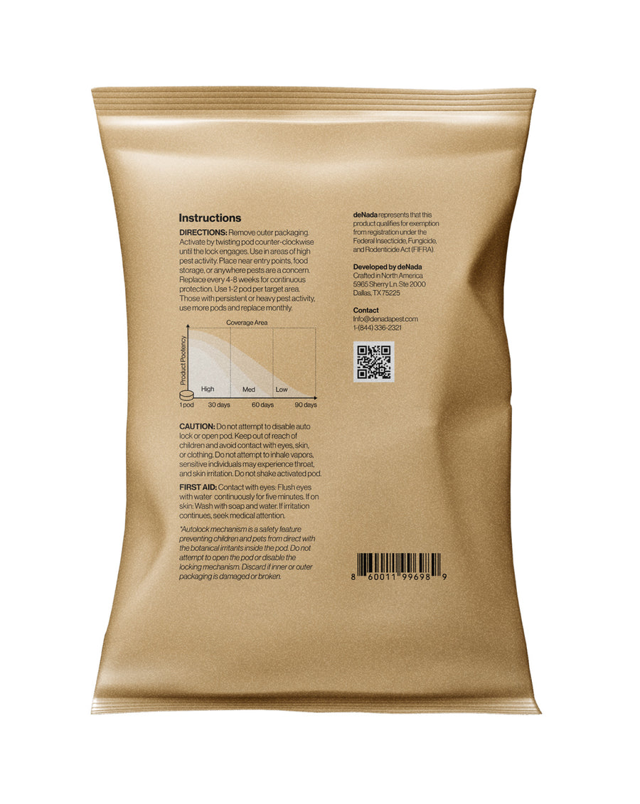 Traditional insect control relies on harsh chemicals, messy sprays, and unsightly traps. deNada is different — a plant-powered pod designed to help deter crawling insects while keeping your home calm, clean, and protected. Simply twist to activate and let the pod work quietly in the background. With passive diffusion, biodegradable materials, and no plugs, batteries, or synthetic pesticides, deNada delivers effortless, nature-inspired protection.